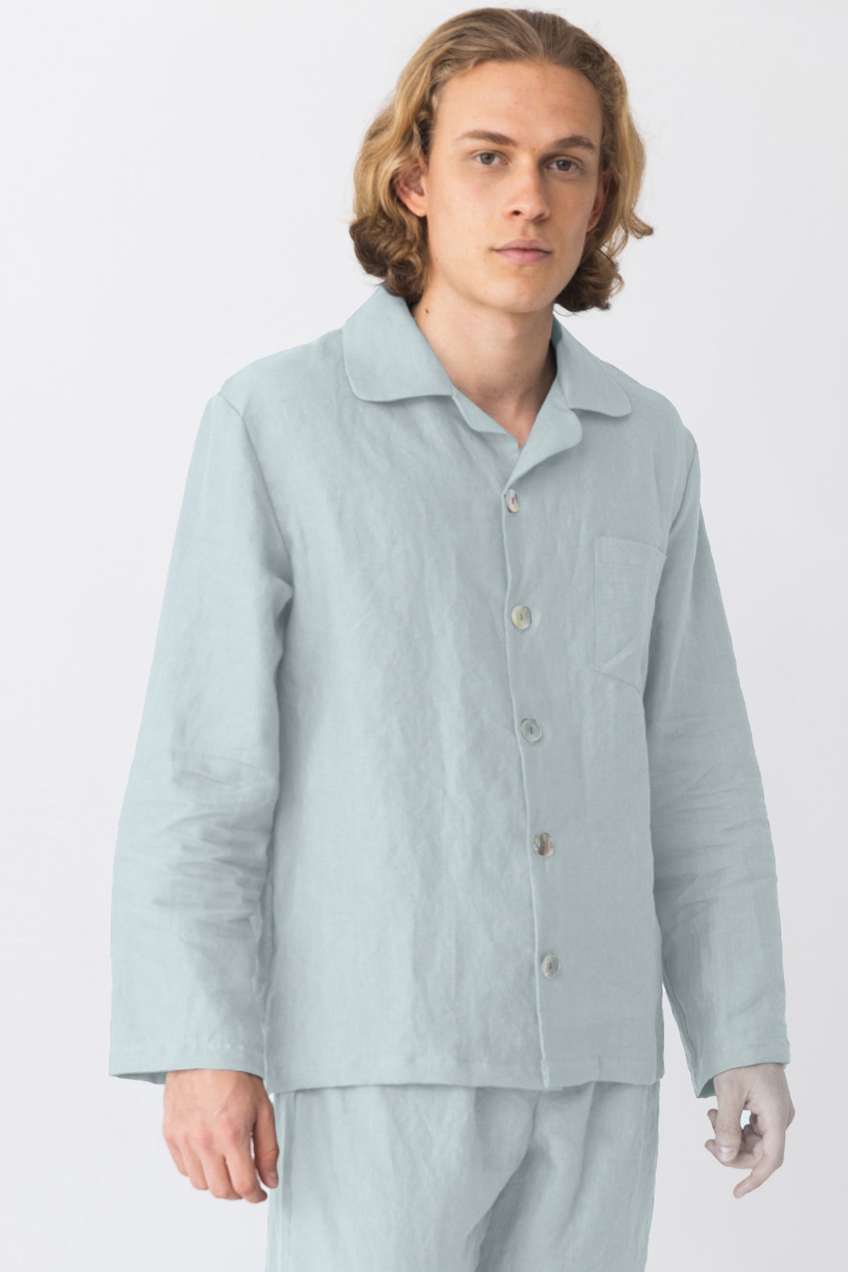 Men's long-sleeved pajama jacket in icy blue linen - Diego