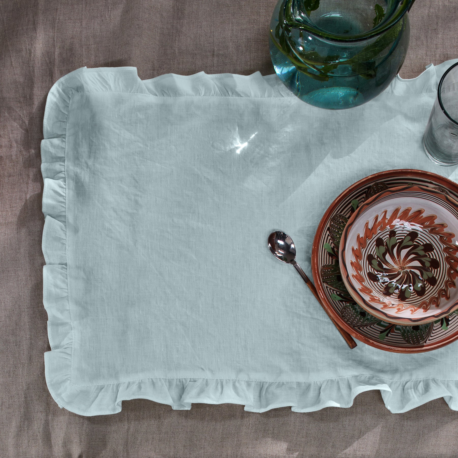 Set of washed linen ruffled placemats - Icy blue