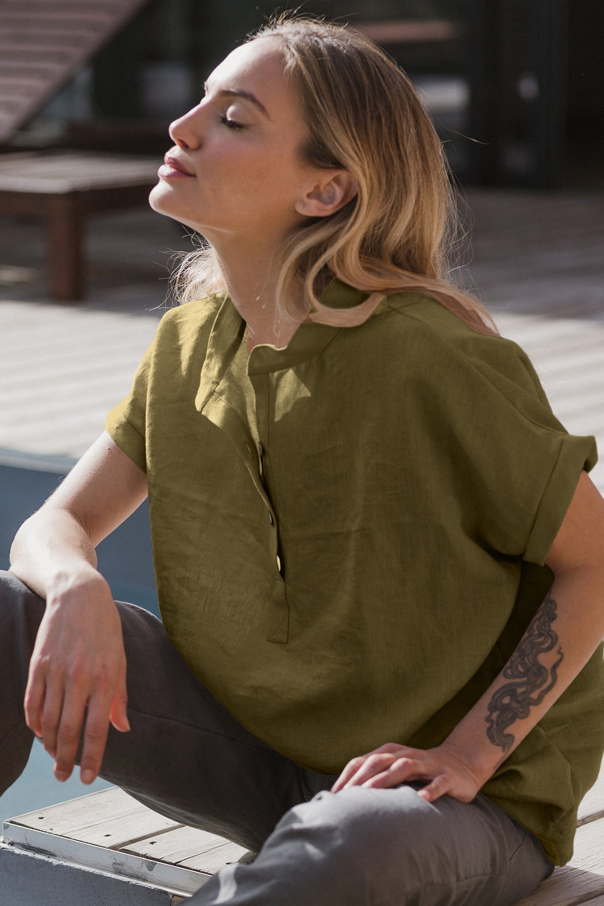 Short-sleeved linen blouse green olive - Flor