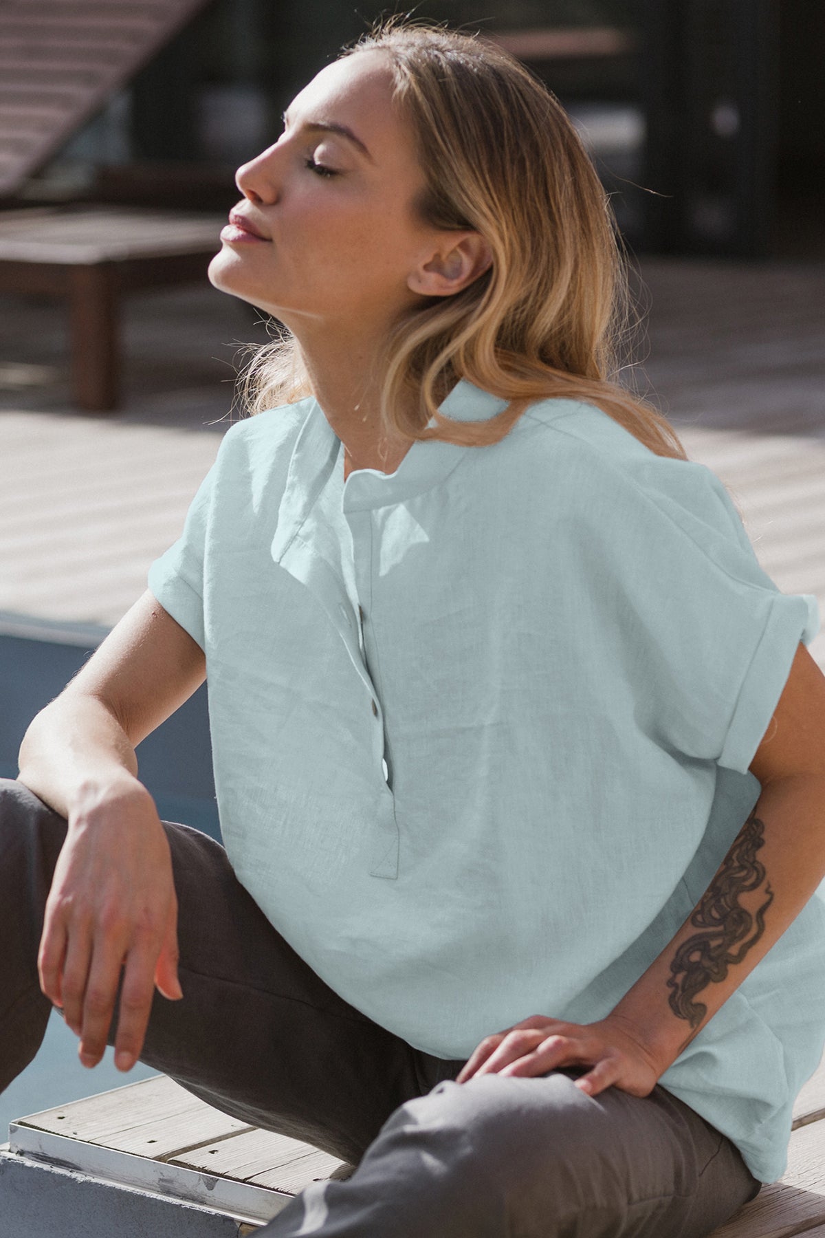 Short-sleeved linen blouse icy blue - Flor